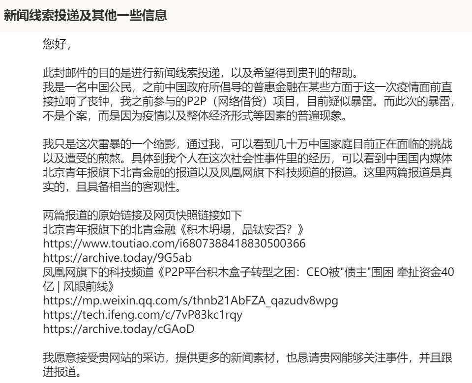第一篇 第二篇 第三篇 第四篇 第五篇 第六篇 第七篇 第八篇 眼下自媒体泛滥,流量这碗饭吃相着实难看 目前为止,看到了一些“正规军”的报道,暂且放上,以防万一也备份了网页快照,一并放上了 一般来说,像北青和凤凰这种媒体,出稿以后无论是自动采集还是人工手动,其他网站/媒体的转载都会有一些,但是就目前这两篇文章来说,真的凤毛麟角少得可怜 有能力的难友,可以把这几篇文章,作为新闻线索,投递给其他媒体,包括国内以及国外,投递方向可以是金融、民生、政治、科技、互联网等等,或者是大V,所谓的那些KOL,都可以投递一下,且不论对方是否会采纳,万一呢? 媒体,也是咱们的阵地之一,希望各位难友各显其能各显神通吧 部分媒体联络邮箱 BBC 我写信过去的抓图给各位难友参考 举例国内几个正规大媒体的联系方式 北京日报 01065591515 积木盒子难友之家 https://fuckjimu.tk/