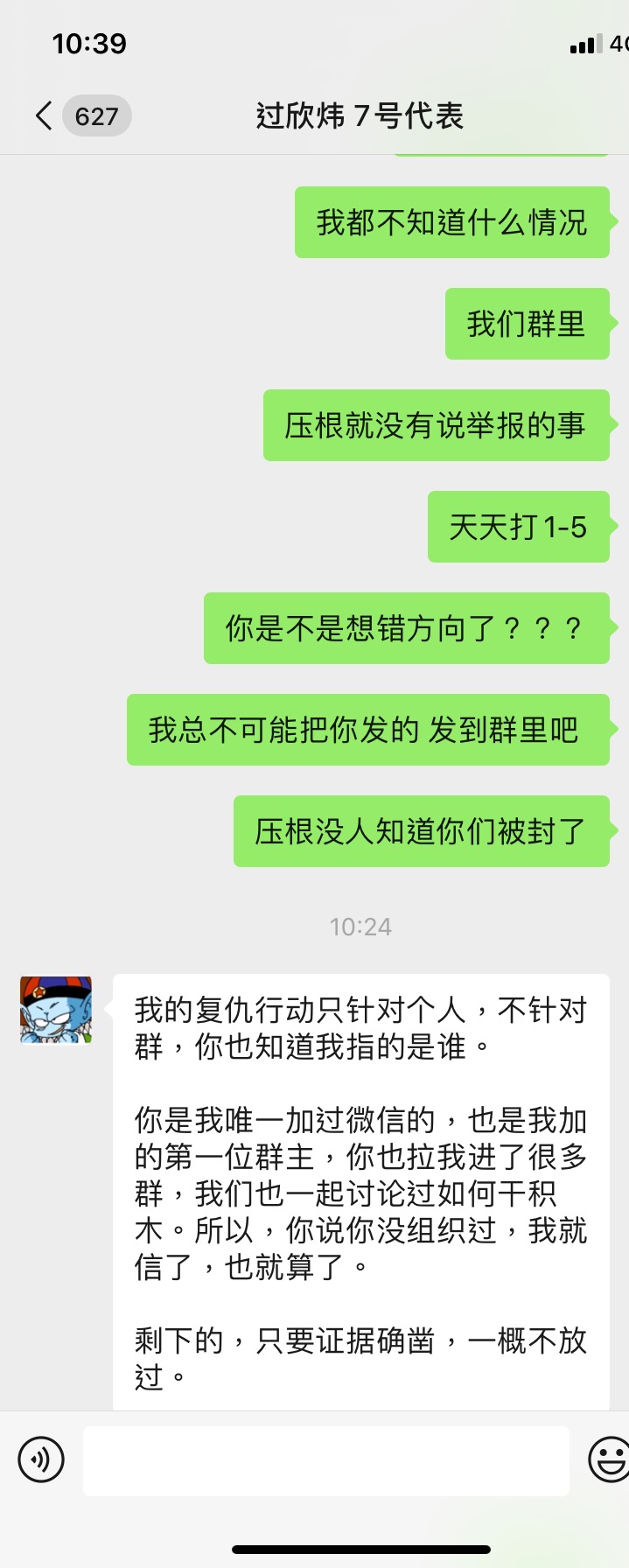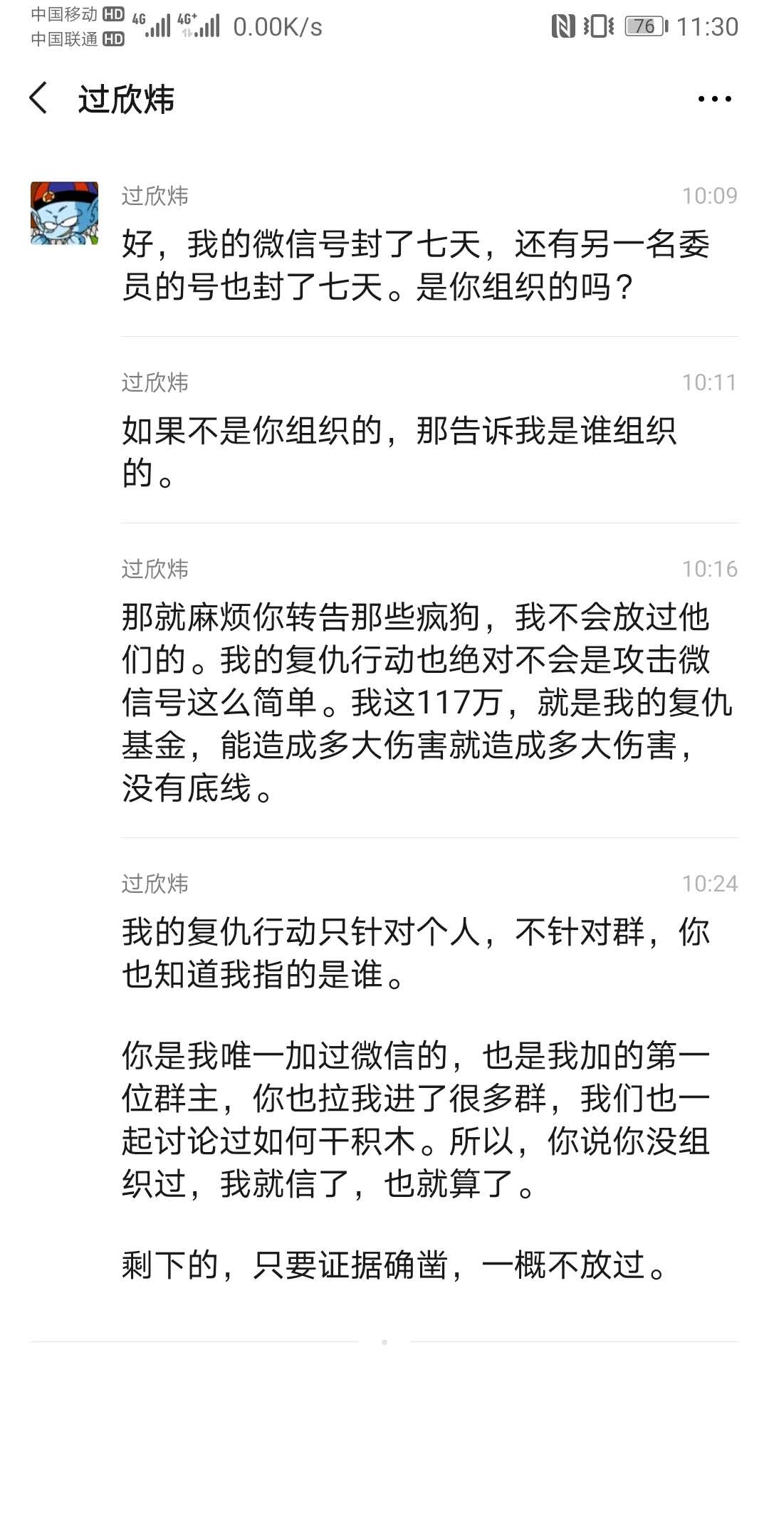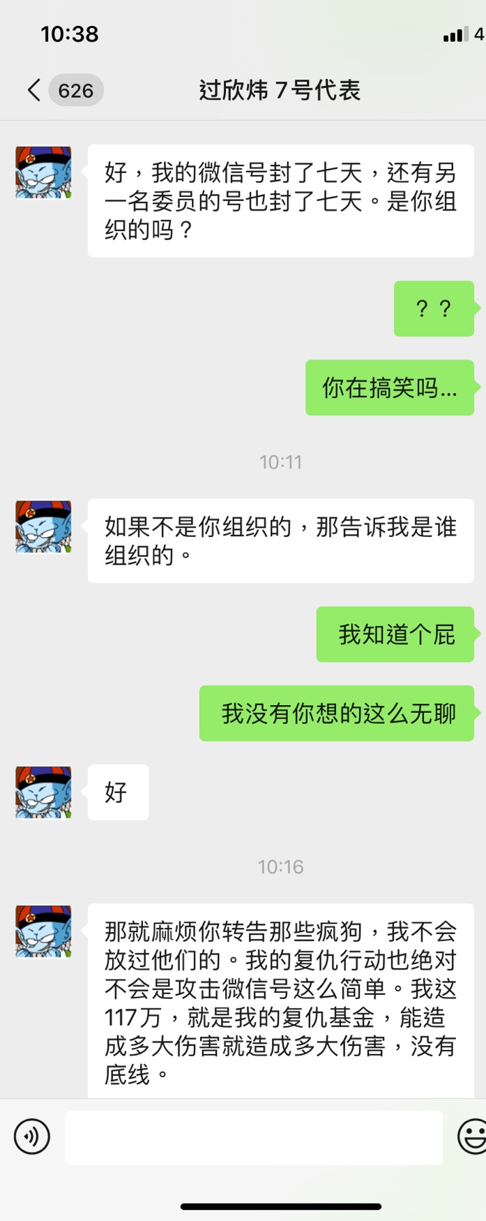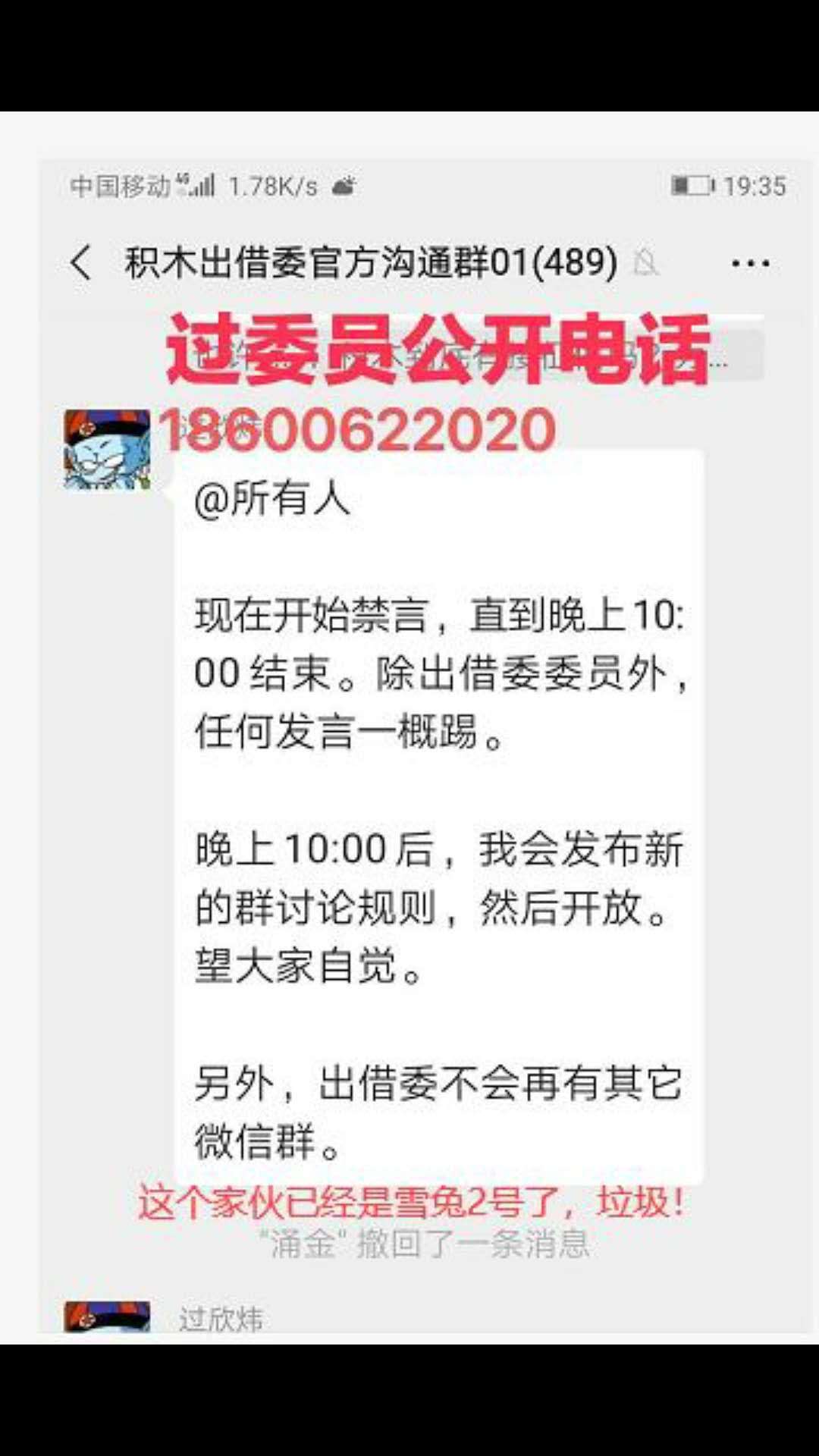 有这么几点事情我想是说一下 4006281176 01086390090 这两个号码是积木盒子官方的客服电话,现在已经撤销掉了 首先说,大家明确一个概念,就是网传。大家不用揣摩文件流出的目的,总归一句话,跟积木没得可聊,我是一心要公检法的。另外多说一句,网传的兑付方案,我看本质上和之前3月底那个没毛区别,具体3月底那个积木官网公告的方案解析,请参看我以前的文章关于《积木盒子转型兑付方案征求意见稿》update2 这个群,我理解有两层意思。一个是获取不知情难友的确权(具体为何要进行所谓的确权,我说过很多次,参看以前文章),另一个是给监管做做样子,QQ群也是官方沟通渠道。那么我们难友该怎么做呢? 我希望最终积木这些个官方群,就是积木给咱们收集被蒙在鼓里其他不明真相的难友用,拉战友。除了这个,积木只能禁言,自说自话,开了发言,也就只能忙着删各位发言。这样儿,就达到目标了。 出借委员会本应是做什么的大家都清楚,这里不做过多讨论。姓过的委员这些天已经被骂的挺惨的了,大家对他是什么态度真正的难友心里都清楚。作为出借委的一员,现在爆出他又扬言威胁恐吓真正的难友,我觉得不知道是该哭该笑。具体什么情况大家看图吧 网传过委员自己公开的电话,不知真假,大家可以打打问问看,如果是他,先别骂他,先问问他117万积木是不是已经给他了? 最后复习一下目前阶段的口号吧一、积木盒子官方客服电话号码撤销掉了,高度疑似彻底跑路