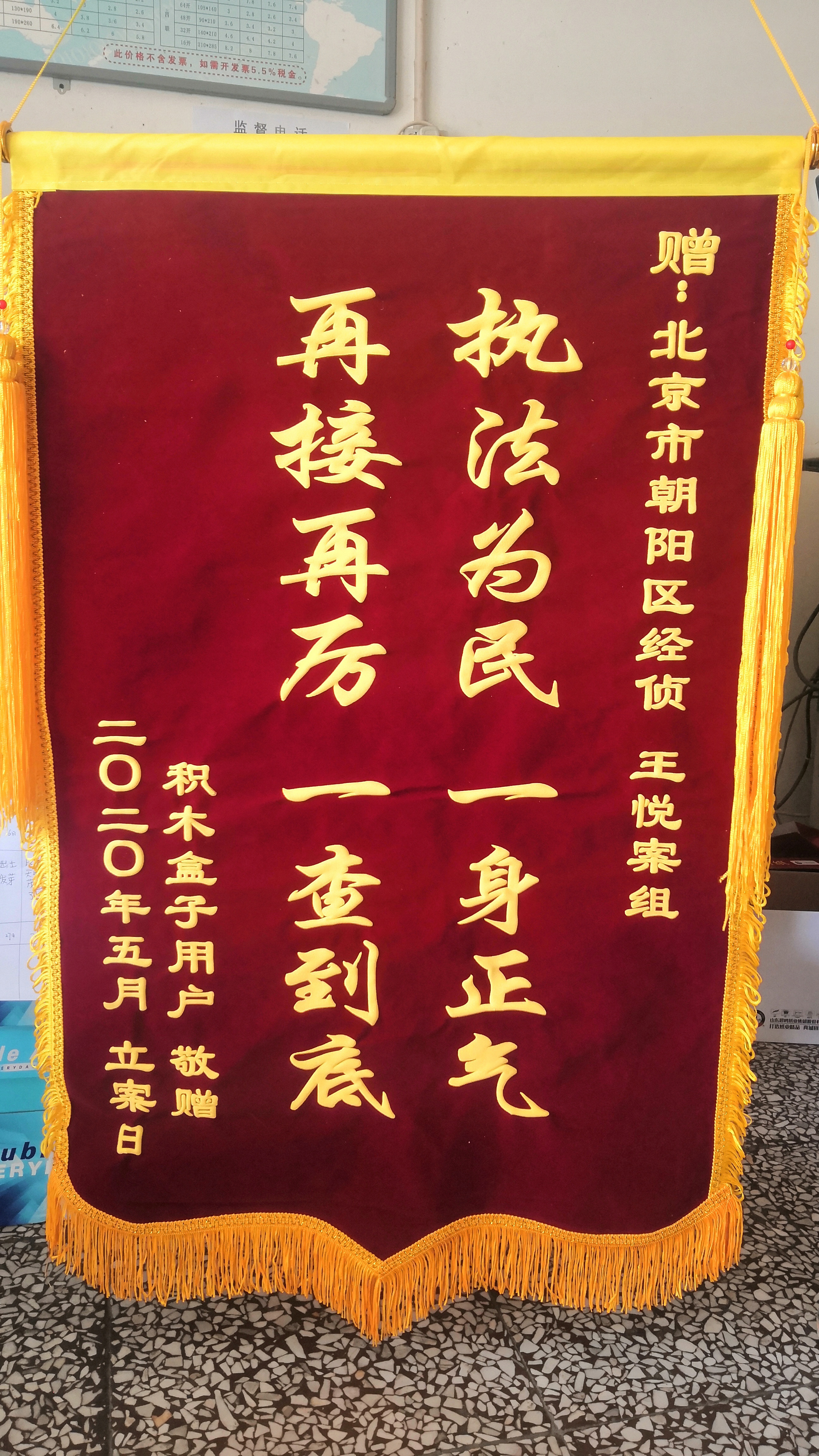现在是5月23号01点25…严格意义上说,昨天,5月22日,上边照片里这面锦旗已经送到朝阳经侦王悦案组了